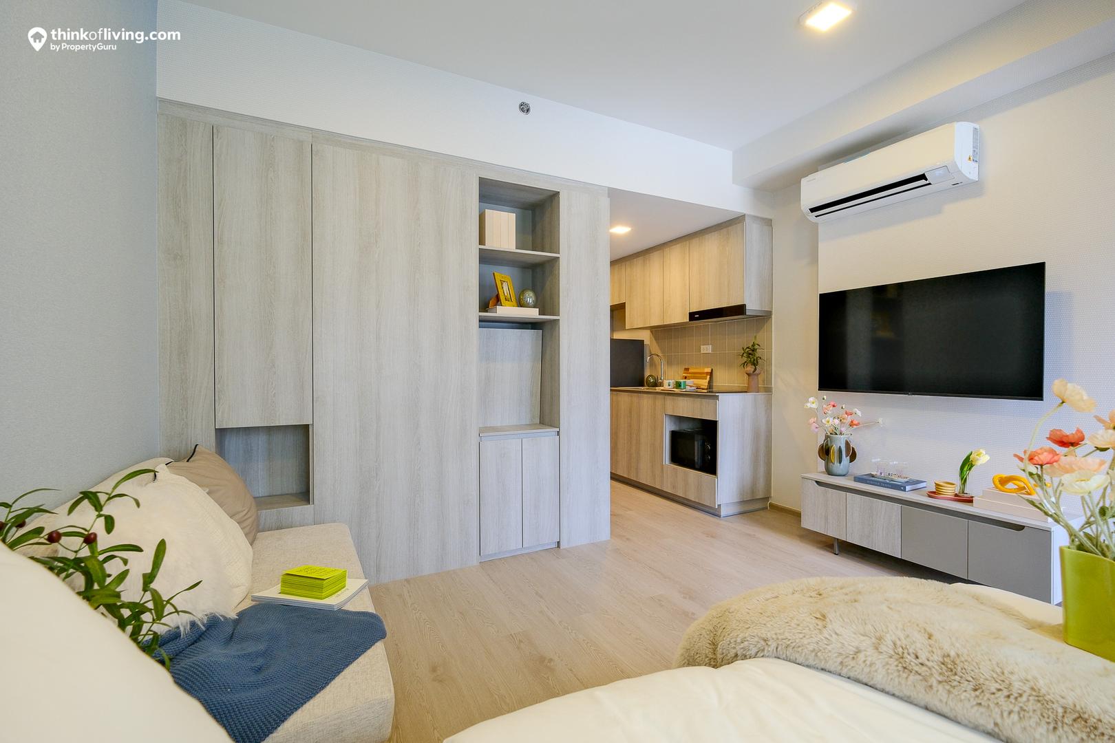 ด้านในเป็น Common Area รวมพื้นที่รับประทานอาหาร พื้นที่นั่งเล่นและเตียงนอนเข้าไว้ด้วยกัน ซึ่งเฟอร์นิเจอร์จะได้มาเหมือนในห้องตัวอย่างเลย