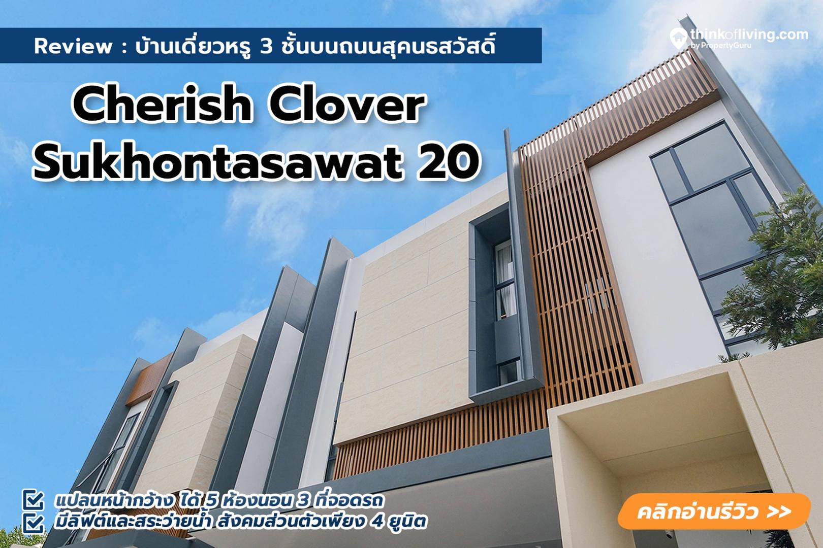 Cherish Clover Sukhontasawat 20 (เฌอริช โคลเวอร์ สุคนธสวัสดิ์ 20) เป็นโครงการบ้านเดี่ยวหรู 3 ชั้นที่มีเพียง 4 ยูนิต ตั้งอยู่ในซอยสุคนธสวัสดิ์ 20 ภายในโครงการไม่มีพื้นที่ส่วนกลาง แต่มีรั้วรอบโครงการ (รั้วทึบ + รั้วโปร่ง) และมีประตูกั้นทางเข้า – ออกเป็นรางเลื่อนอัตโนมัติที่ลูกบ้านสามารถควบคุมการเปิด – ปิดด้วยรีโมทได้ ผังโครงการแบ่งอาคารเป็น 2 ฝั่ง หน้าบ้านหันขนานไปกับทิศเหนือ – ทิศใต้ ซึ่งเป็นทิศที่ไม่โดนแดดโดยตรง แล้วยังได้ลมจากธรรมชาติ จึงถือว่าเป็นทิศยอดนิยมสำหรับคนหาบ้านเลย โดยถนนตรงกลางได้มากว้าง 7 เมตร พื้นปูด้วยกระเบื้อง ดูเรียบร้อย สวยงาม