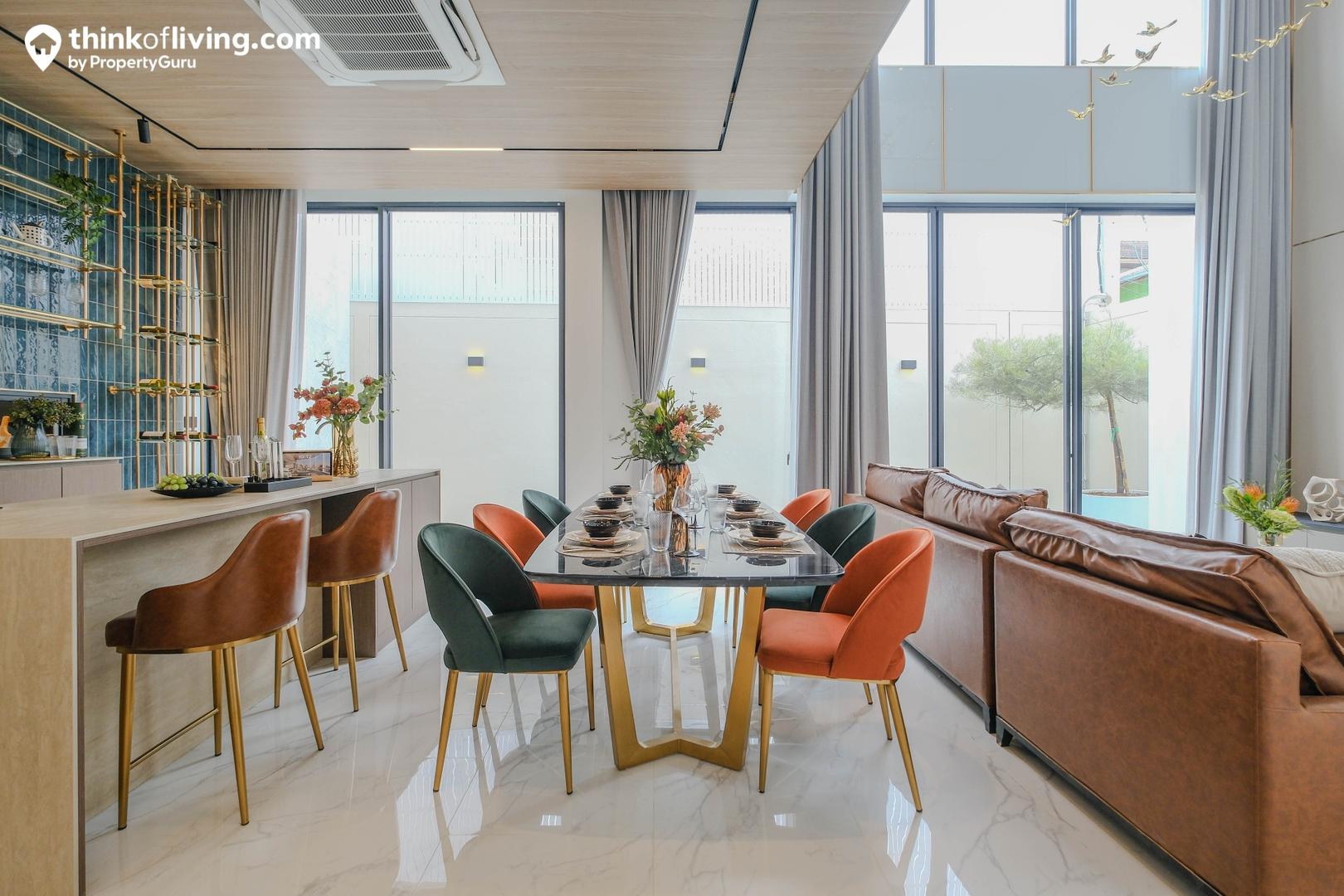 ชั้น 1 ในบ้านตัวอย่างออกแบบให้มีพื้นที่รับประทานอาหารและ Pantry วางเป็นโต๊ะยาวพร้อมเก้าอี้ได้ 6 – 8 ที่นั่ง มี Island ตรงกลางไว้ใช้เป็นมุมเตรียมอาหารหรือชงเครื่องดื่มแบบเบาๆได้ ติดกับด้านข้างเป็นครัวปิด มีประตูทึบกั้นแยกมาให้เป็นสัดส่วน เดินใช้งานง่าย แถมยังมีหน้าต่างบานเลื่อนเล็กๆไว้ใช้เป็นช่องส่งอาหารได้ด้วย