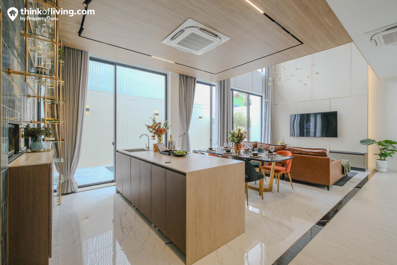 เมื่อเปิดประตูเข้ามาจะเจอ Common Area ขนาดใหญ่ ดูโปร่งโล่ง ด้านข้างได้ประตูบานเลื่อนกระจกหลายจุด ทำให้สามารถ Take View สระว่ายน้ำด้านหลังได้แบบ 180 องศา ถือเป็นข้อดีของแปลนหน้ากว้าง วัสดุพื้นในบ้านมาตรฐานจะได้เป็นกระเบื้องแกรนิตโต้ขนาด 60×120 เซนติเมตร