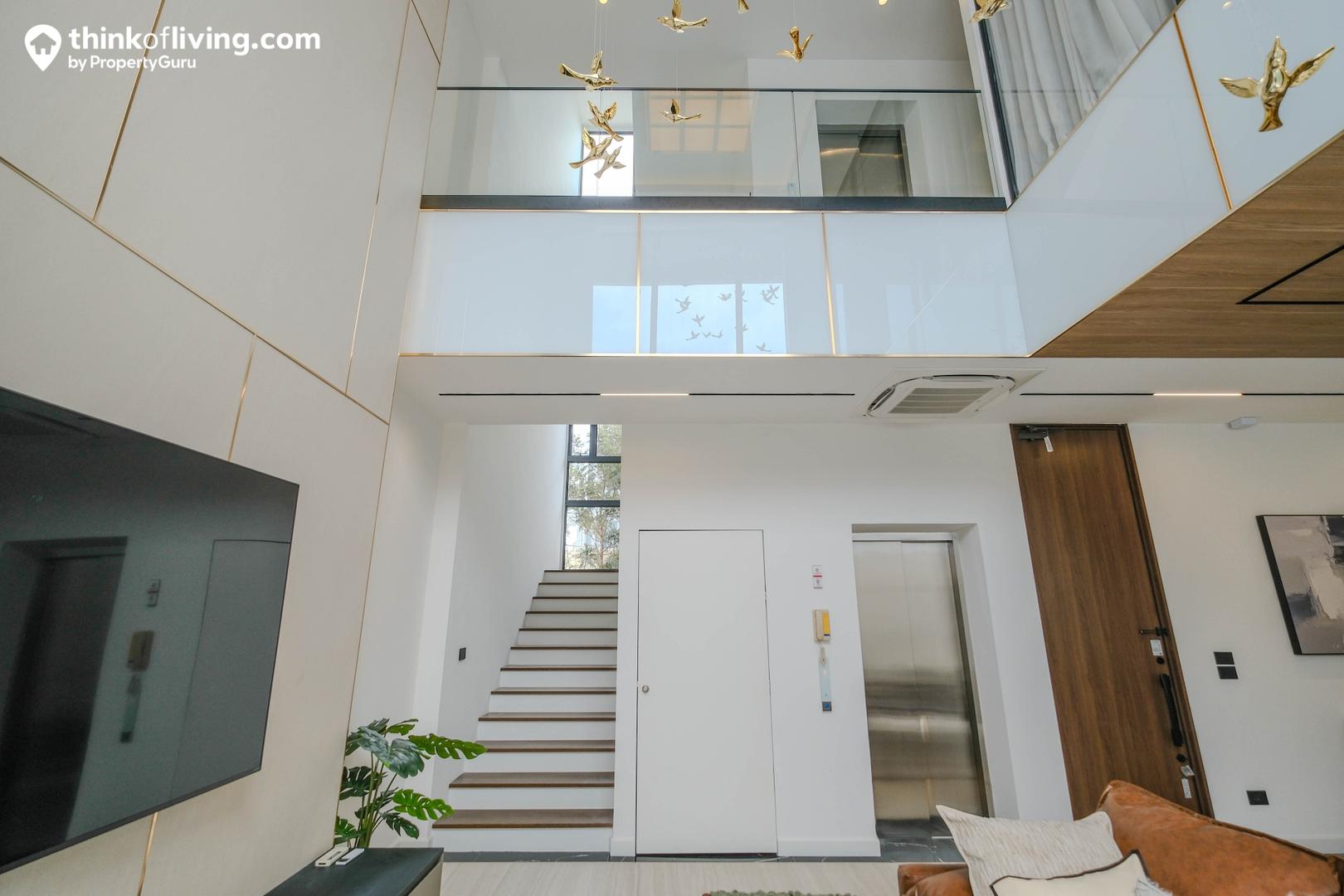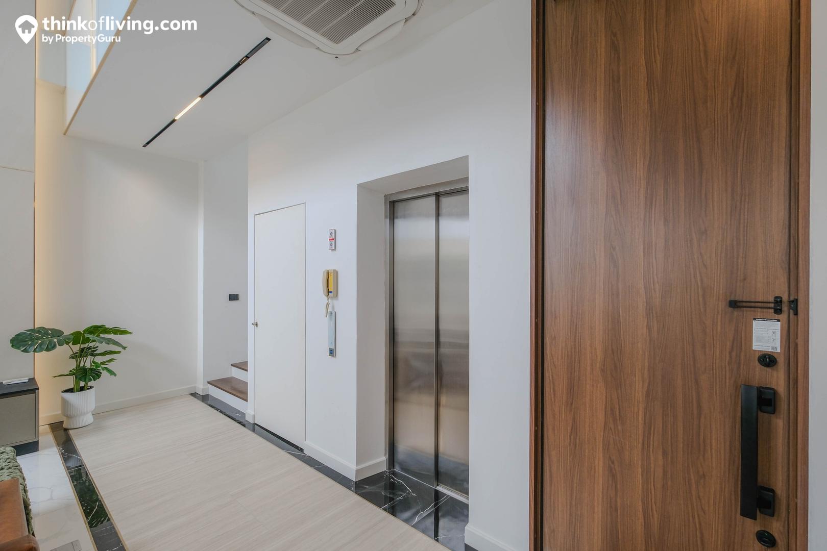 ติดกับประตูทางเข้าเป็นลิฟต์โดยสารและโถงบันไดขึ้นชั้น 2 โดยลิฟต์ใช้ของยี่ห้อ Jardine Schindler จุได้ 5 คน รองรับน้ำหนัก 400 กิโลกรัม การทำงานค่อนข้างเงียบ จึงไม่ต้องกังวลเรื่องเสียงรบกวน สำหรับความสูงฝ้าเพดานปกติได้มาประมาณ 3.2 เมตร มีแอร์แบบ Cassetted Type 4 ทิศทาง ติดตั้งมาให้ ตำแหน่งเหมือนในบ้านตัวอย่าง