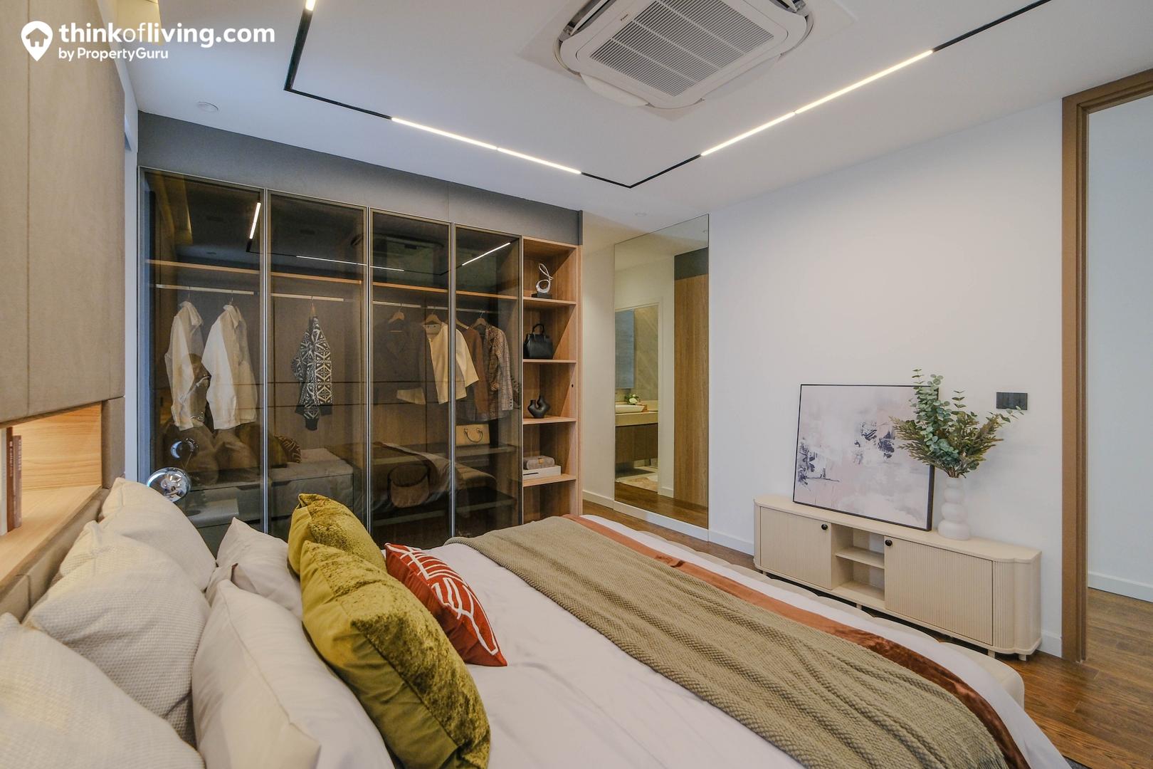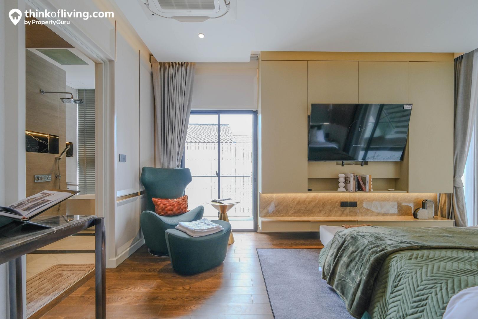 ติดกันเป็นห้องนอนรองอีกห้อง ตรงกลางวางเตียงนอน 5 – 6 ฟุต มีมุมให้วางตู้เสื้อผ้า , โต๊ะเครื่องแป้งได้ครบ ใช้เป็นมุมแต่งตัวเพิ่มได้ ด้านในมีห้องน้ำแยกใช้งานในตัวเช่นกัน