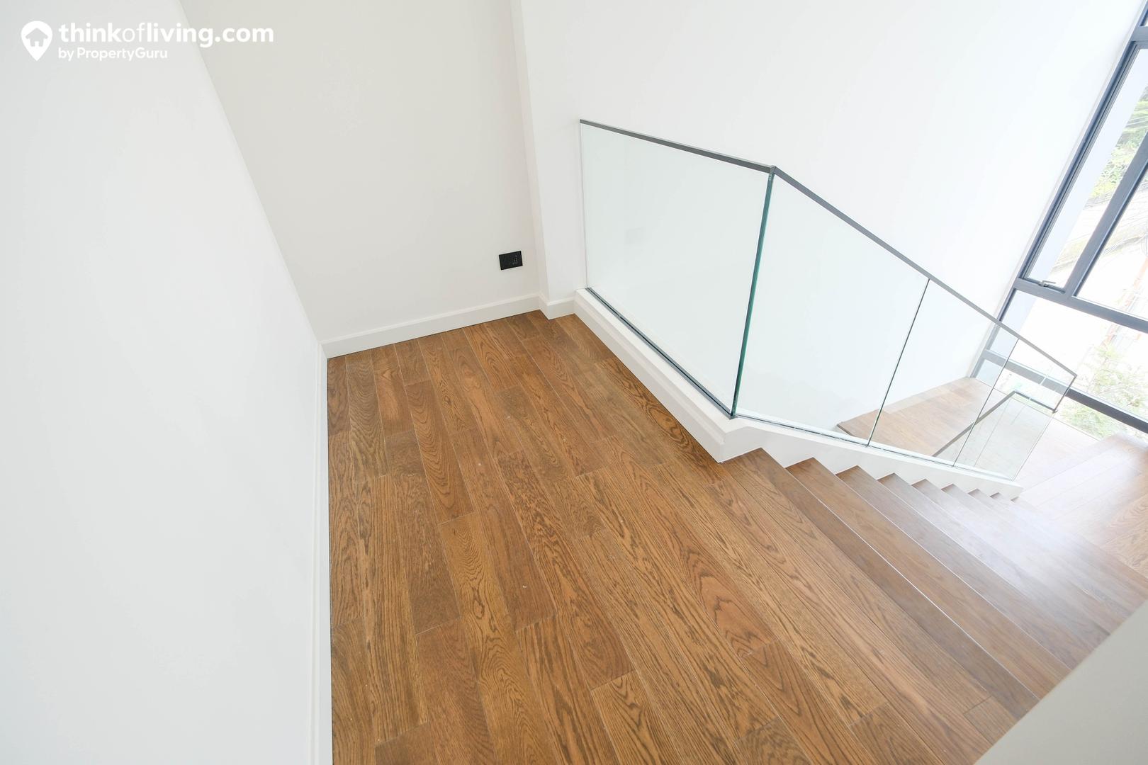 บันไดขึ้นชั้น 2 อยู่ใกล้ประตูทางเข้าบ้าน โครงสร้างเป็นคอนกรีตเสริมเหล็ก ปิดผิวด้วย Engineering Wood ความกว้างถึง 1.22 เมตร ลูกตั้งสูง 17 เซนติเมตร ลูกนอนกว้าง 32 เซนติเมตร ใช้งานขึ้น – ลงได้สะดวกมาก ด้านข้างติดตั้งราวกันตกเป็นกระจกเปลือยให้ความรู้สึก Modern ดูโปร่งโล่ง ตรงชานพักมีหน้าต่างบาน Fix กระจกขนาดใหญ่ มาพร้อมหน้าต่างบานกระทุ้ง 1 จุด ใช้เปิดรับลม ระบายอากาศได้ดี