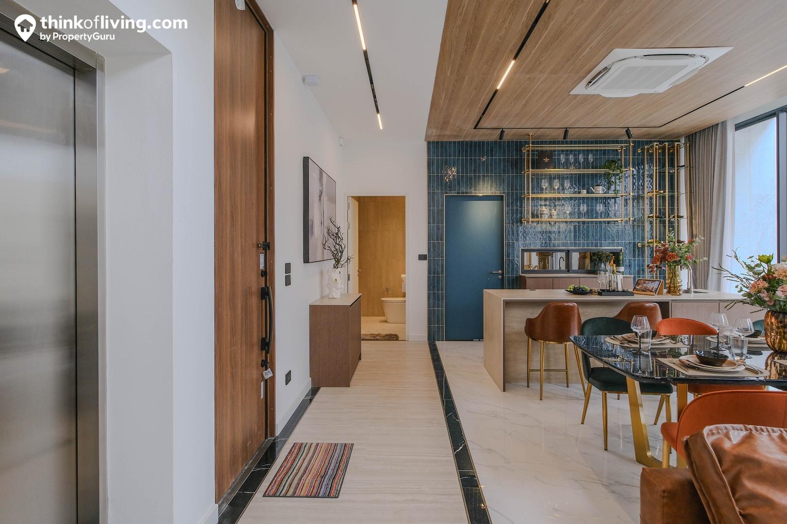 โดยประตูทางเข้าจะอยู่ตรงกลาง พื้นยกระดับขึ้นมาแยกเป็นส่วน Foyer ด้านข้างสามารถ Built – in ทำเป็นตู้รองเท้าเพิ่มได้ ส่วนประตูเข้าบ้านได้มาสูงถึงฝ้า ช่วยเพิ่มความโอ่อ่าให้กับส่วนทางเข้า บานประตูเป็นอลูมิเนียมปิดผิวลายไม้ จาก lixil ติดตั้งมาพร้อม Digital Door Lock ใช้งานได้ 5 ระบบ (กดรหัส , Keycard , Bluetooth , สแกนลายนิ้วมือ , กุญแจ) จาก HAFELE