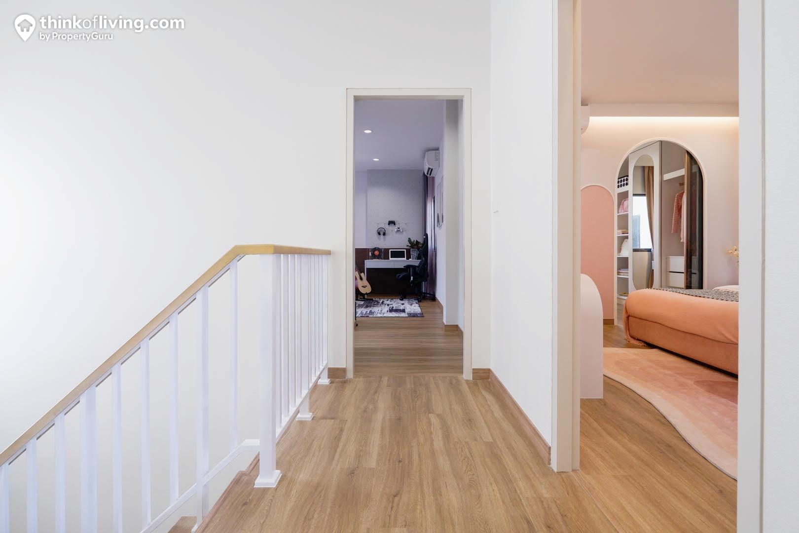 ทางโครงการออกแบบโถงทางเดินชั้น 2 กว้าง 1.35 เมตร เพื่อเชื่อมไปยัง Master Bedroom ซึ่งบริเวณด้านข้างจะเป็นหน้าต่างกระจกแบบ Full Height สูง 2.70 เมตร ยาวตลอดแนวผนัง เพื่อเปิดรับวิวต้นไม้สีเขียวตรง Courtyard ด้านหน้าบ้านนั่นเอง ทำให้ถึงแม้จะอยู่ภายในบ้านก็ได้วิวสีเขียวและบรรยากาศที่สดชื่นดีค่ะ